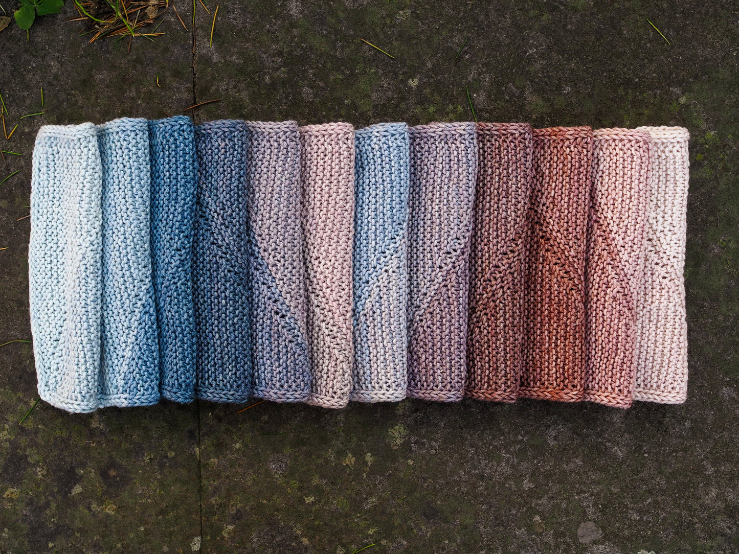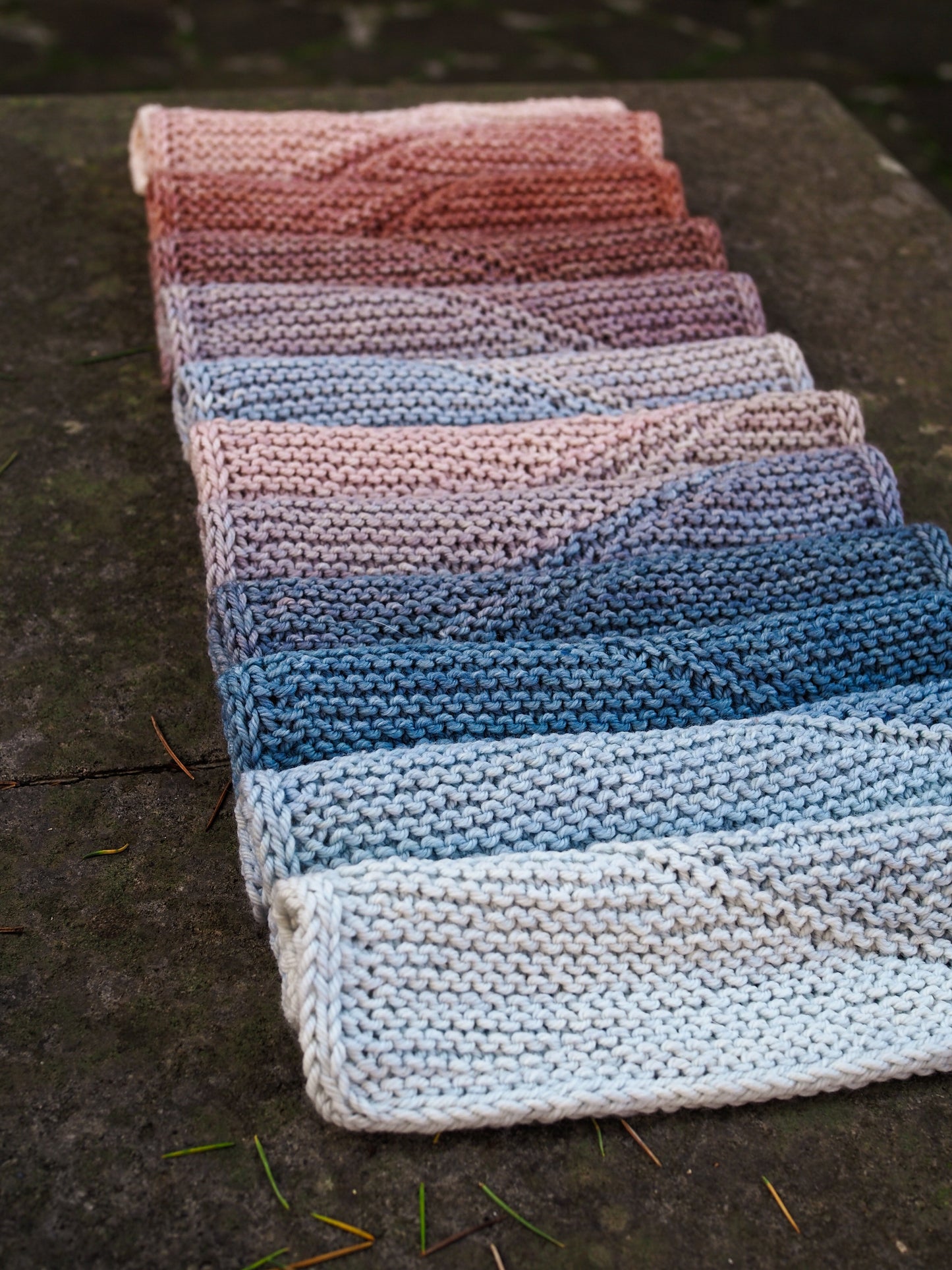 The scarf and wrap are knitted flat in garter stitch, and shaped with short rows to form triangles. One mini skein is used to knit one triangle, and the scarf will be knitted along seamlessly. A knitted on icord border paired with icord cast on and bind off will make for the perfect finishing.