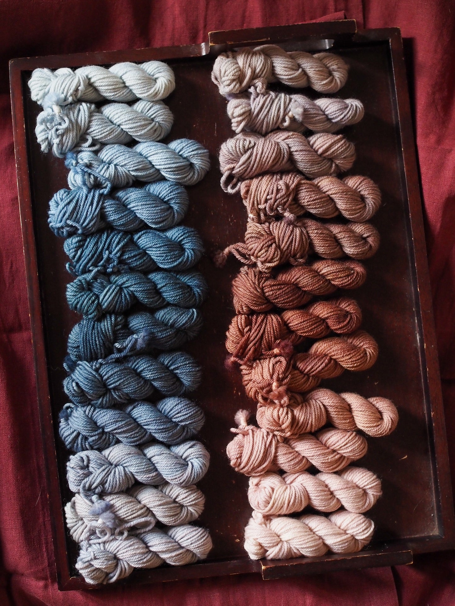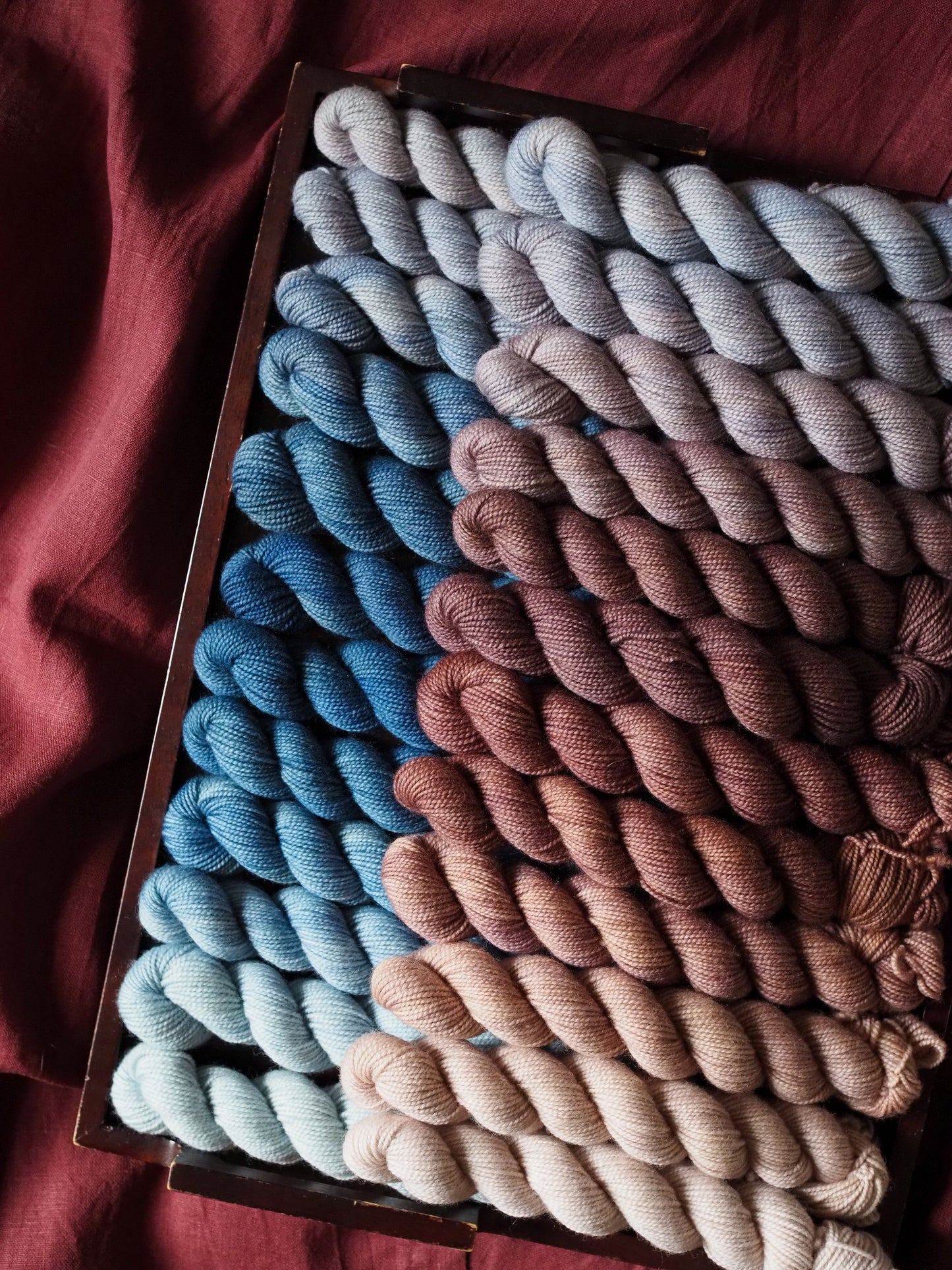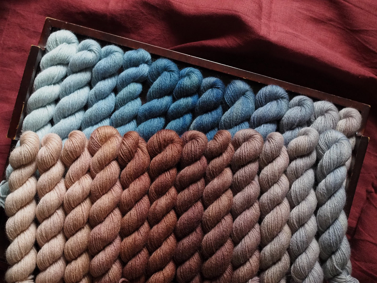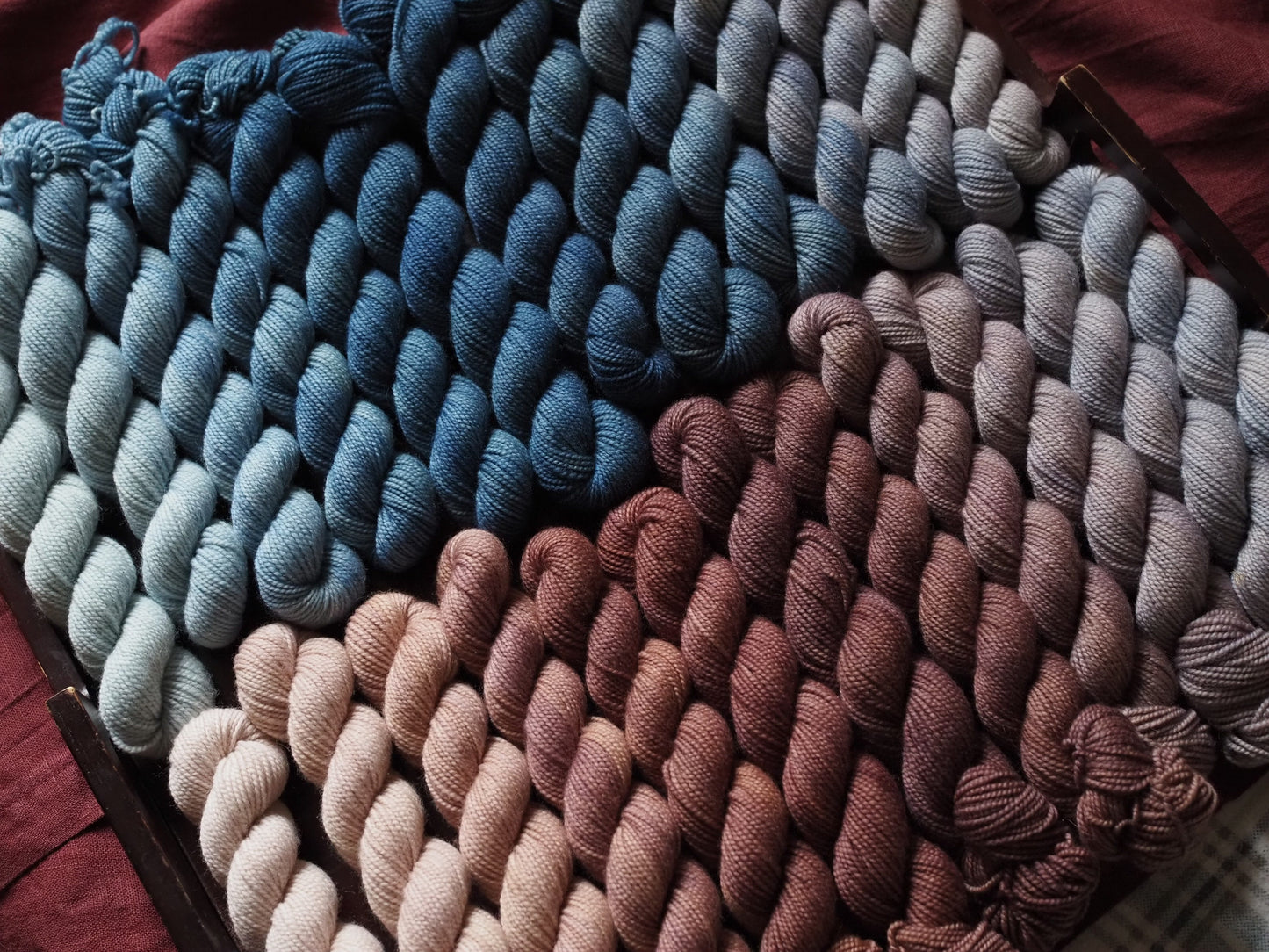 Winter Solstice collection is based on my gradient sets, but with a special twist. The semisolid nuances are paired with tonal ones, which are overdyed to create more variations of the same tones, and create subtle colors that will gently merge one into the next.